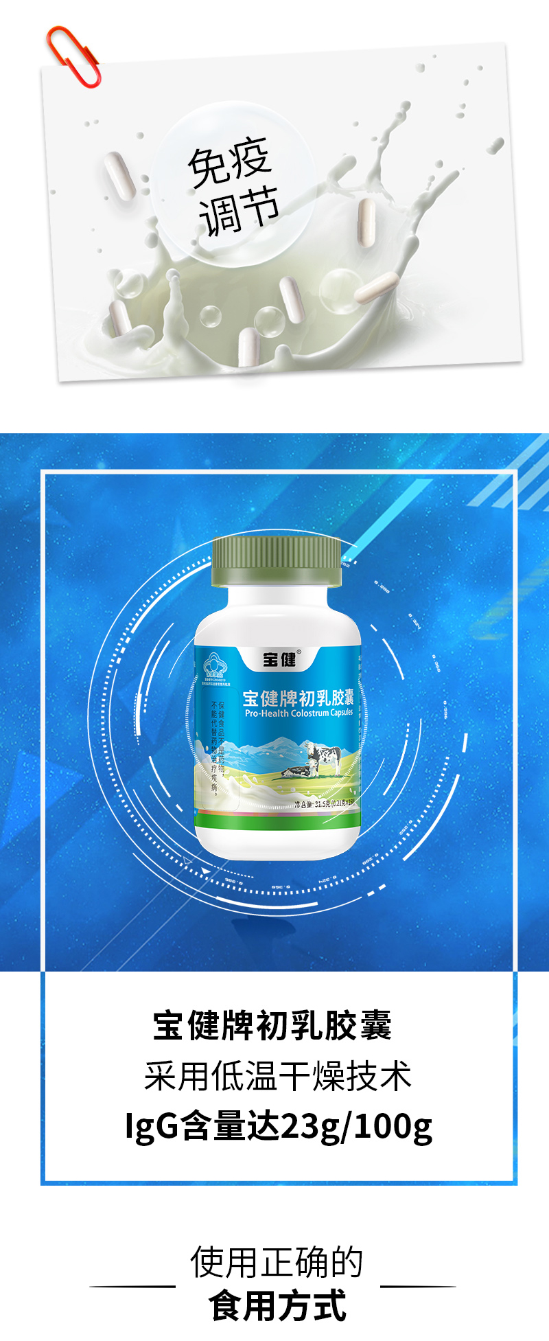 本品是以牛初乳粉为主要原料制成的保健食品,经功能试验证明,具有免疫调节的保健功能。IgG含量达23g/100g。